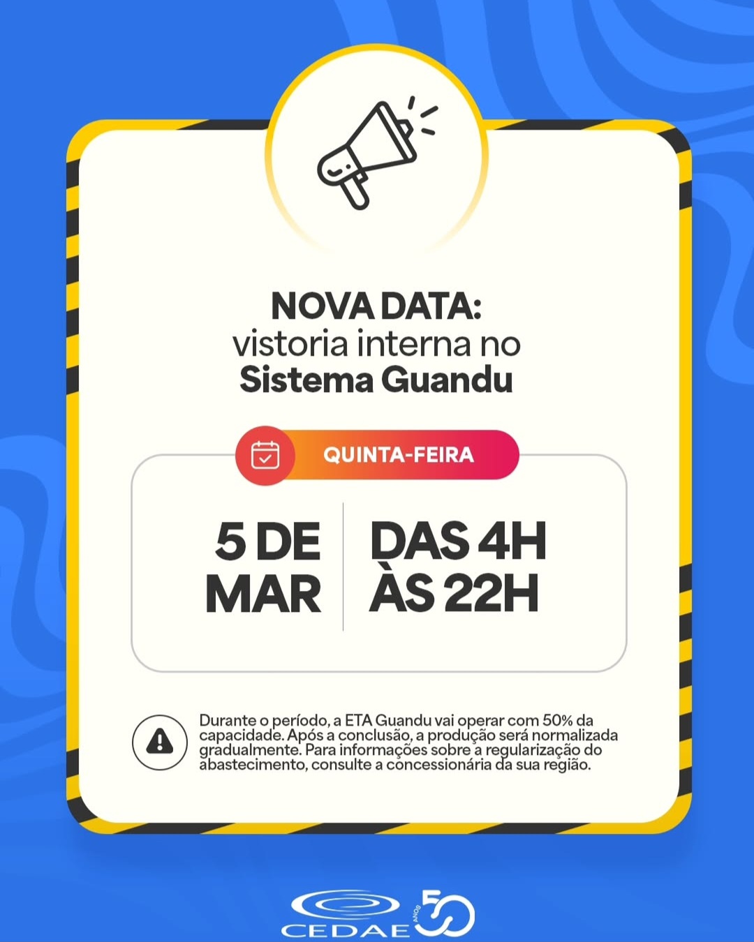 A pedido da concessionária Águas do Rio, o Conselho do Sistema de Fornecimento de Água (CSFA) definiu, em reunião nesta segunda-feira (2/3), ο adiamento da vistoria interna do Sistema Guandu. A operação, prevista para esta terça-feira (3/3), será realizada na quinta-feira (5/3), das 4h às 22h.